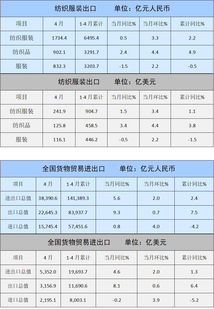 4月,纺织服装出口1734.4亿元,同比增长0.5%,环比增长3.3%,其中纺织品出口902.1亿元,增长2.4%,环比增长4.4%,服装出口832.3亿元,下降1.5%,环比增长2.2%。